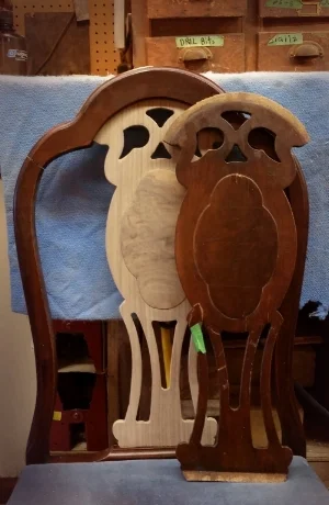 A duplicate of a chair splat. Old and broken (right) new duplicate made by our woodworkers (left)
