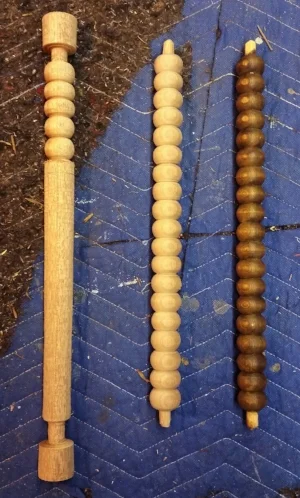 A duplication of a spindle from a 19th century corner stool. The original piece (right) the duplication (middle) and a second spindle in process (left)