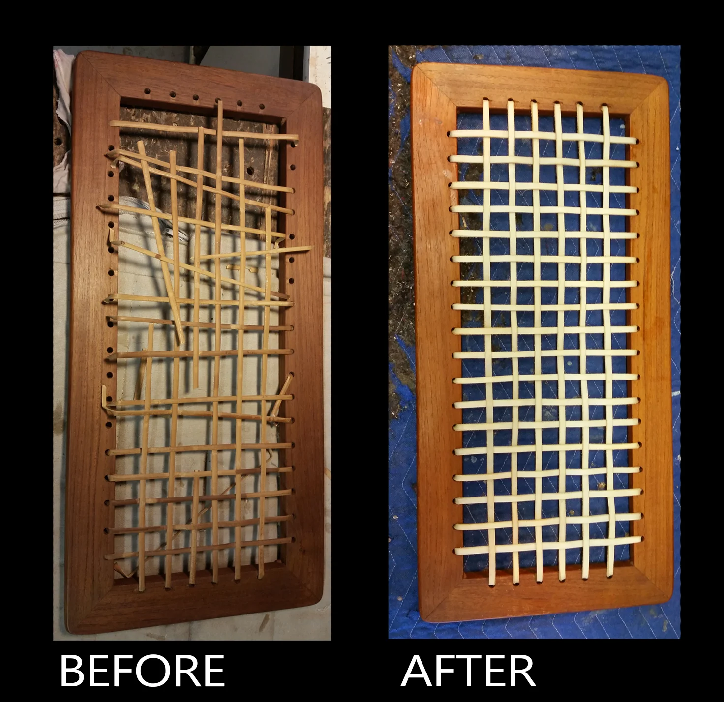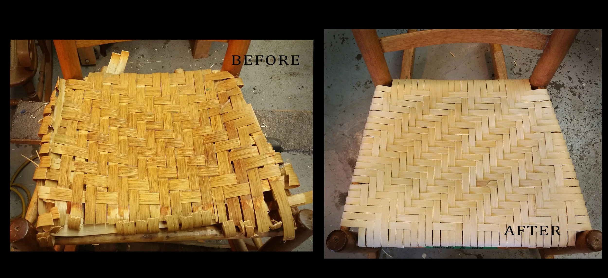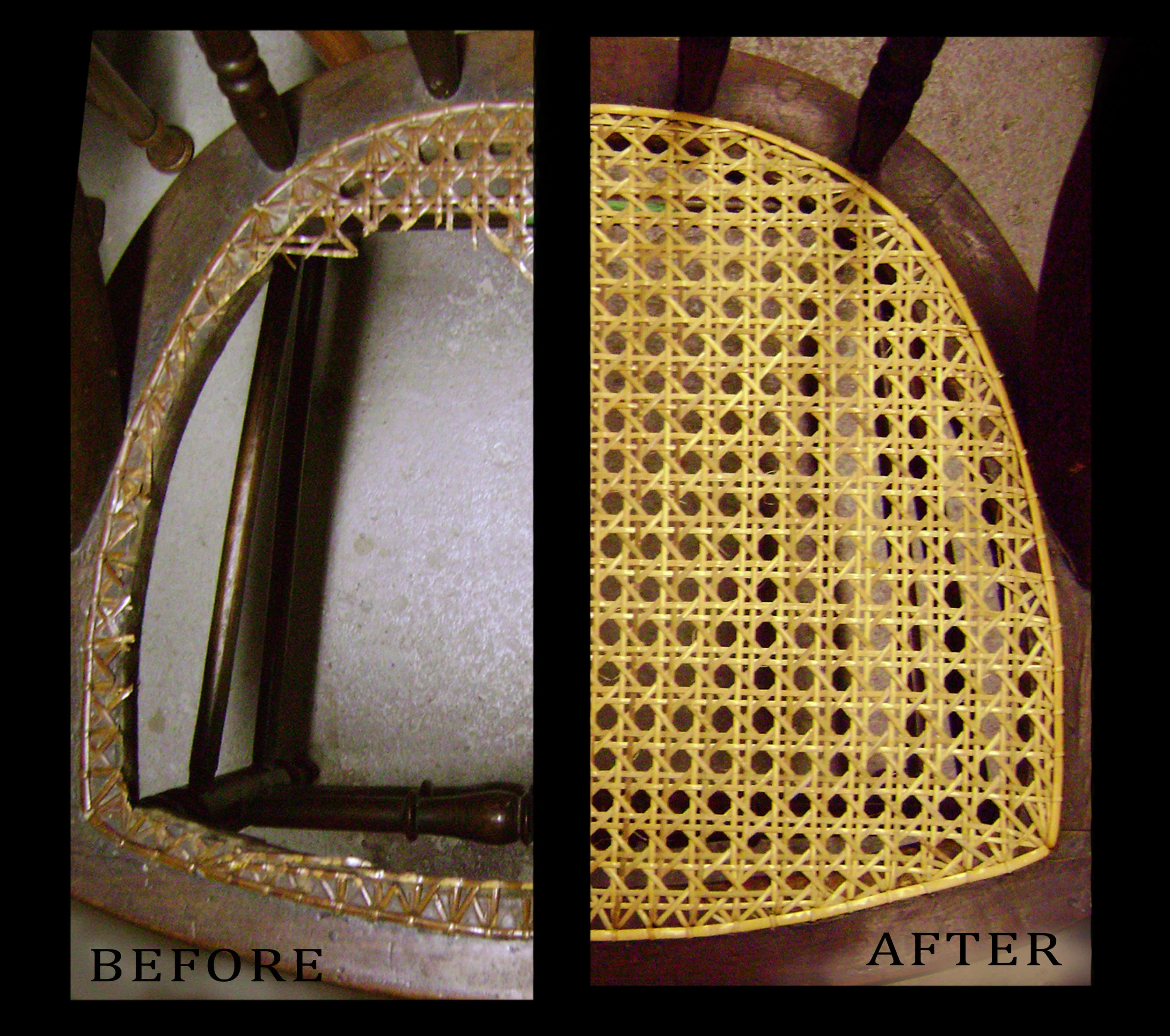 A hand cane chair. Before (left) after (right)